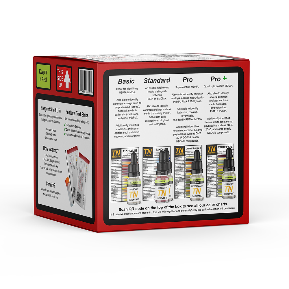 Includes Marquis Reagent Test kit (140 uses), 3x Fentanyl strips, 2 test tubes, and 1 microspoon. Shelf life of two years – store in a cool, dark place. Made in Tennesee, USA. Marquis is the most popular test kit for MDMA. Use a Standard or Pro test kit for better results.
